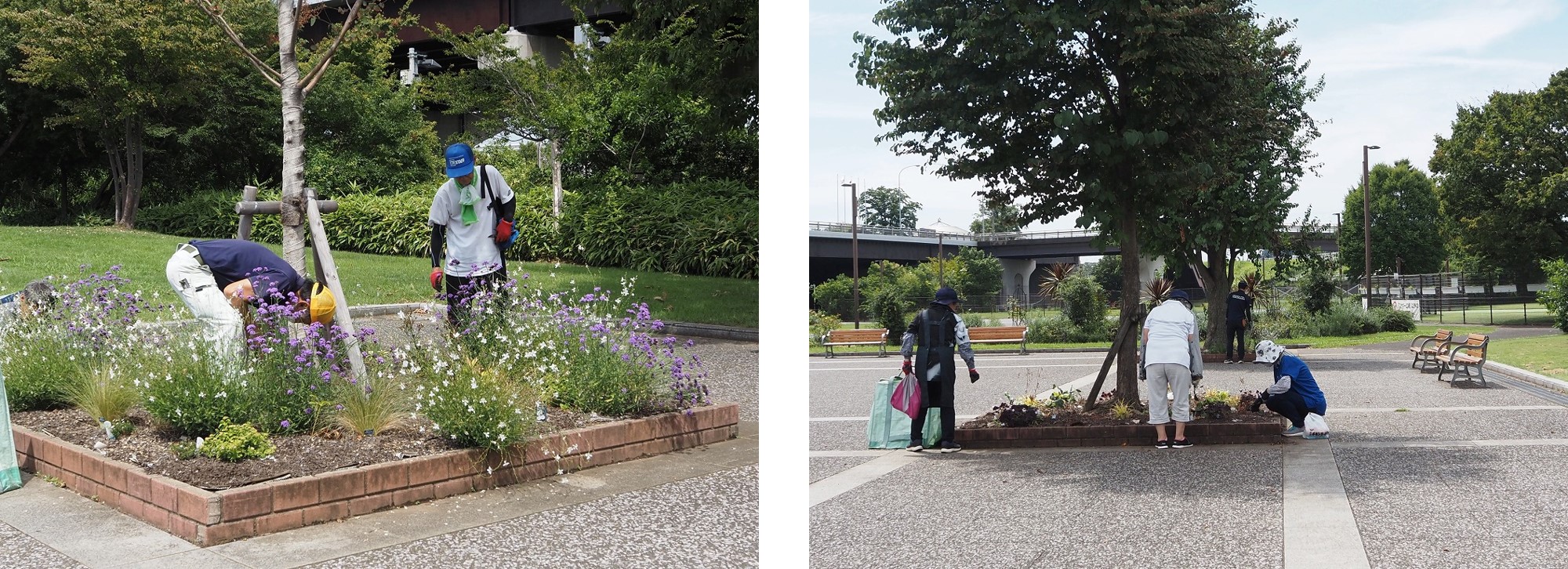 8月28日に、日産スタジアム運営ボランティア グリーン&クリーン部会のみなさんとメンテナンスを行ないました。夏の間に伸びてきて他の植物に絡みついているヤブガラシや、するどいトゲを持つワルナスビなどの除草を行ないました。花の終わったエキナセアやモナルダが面白い形のシードヘッドになっていますが、こちらはもう少し枯れ姿を残しておくことにしました。